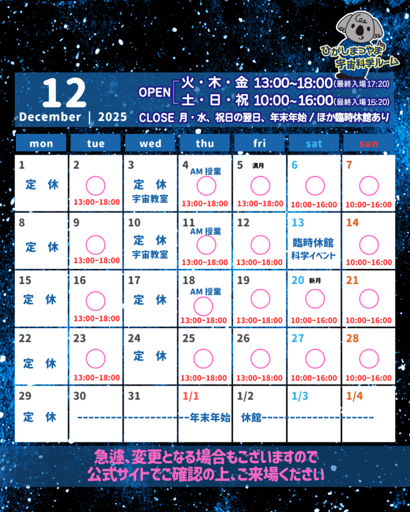 12/13は宇宙科学ルームが都内出張イベントのため臨時休館となります。